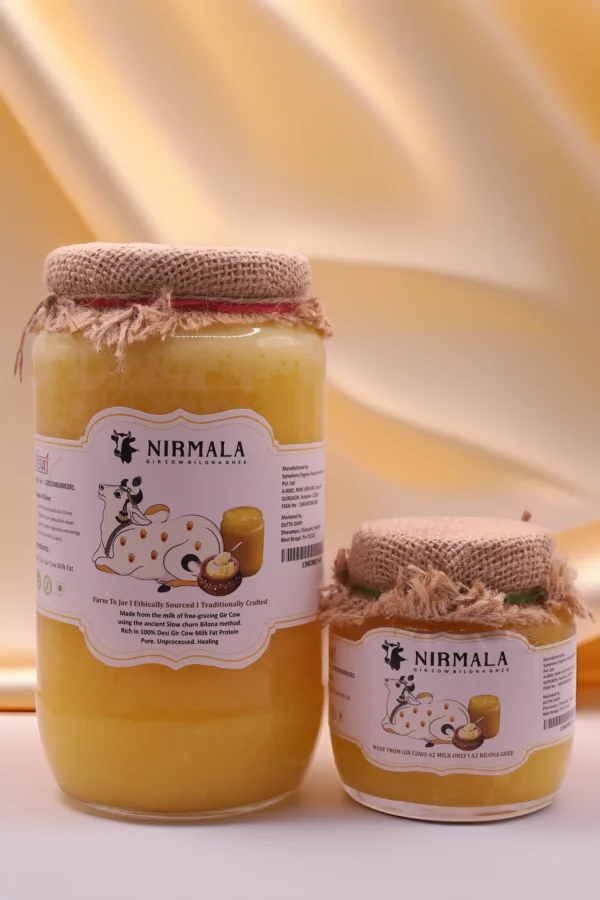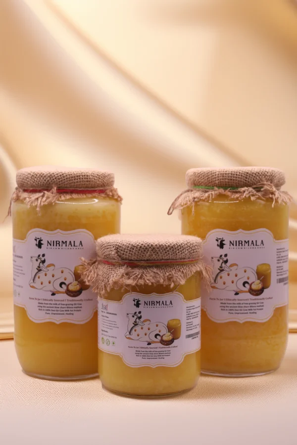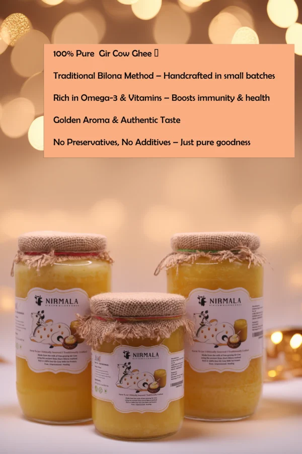 Upgrade your kitchen with Nirmala Naturals Gir Cow Ghee (1L + 250ml Free). Crafted from nutrient-rich Gir cow’s milk through the bilona method, this ghee is wholesome, aromatic, and packed with natural goodness. Ideal for everyday cooking, Ayurveda remedies, or festive dishes, this value pack gives you more purity with every spoonful.