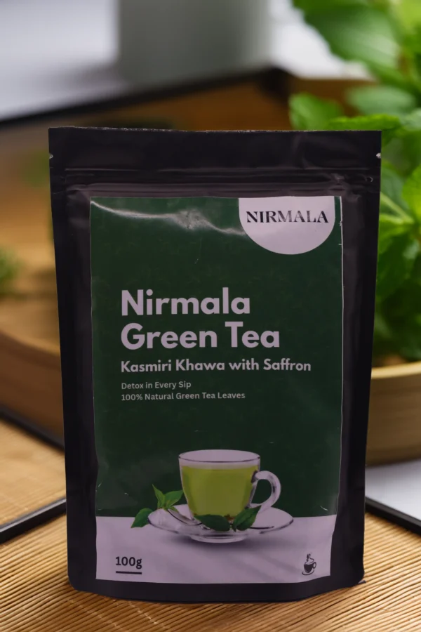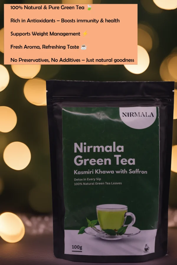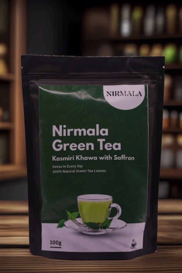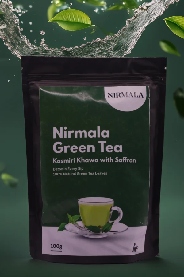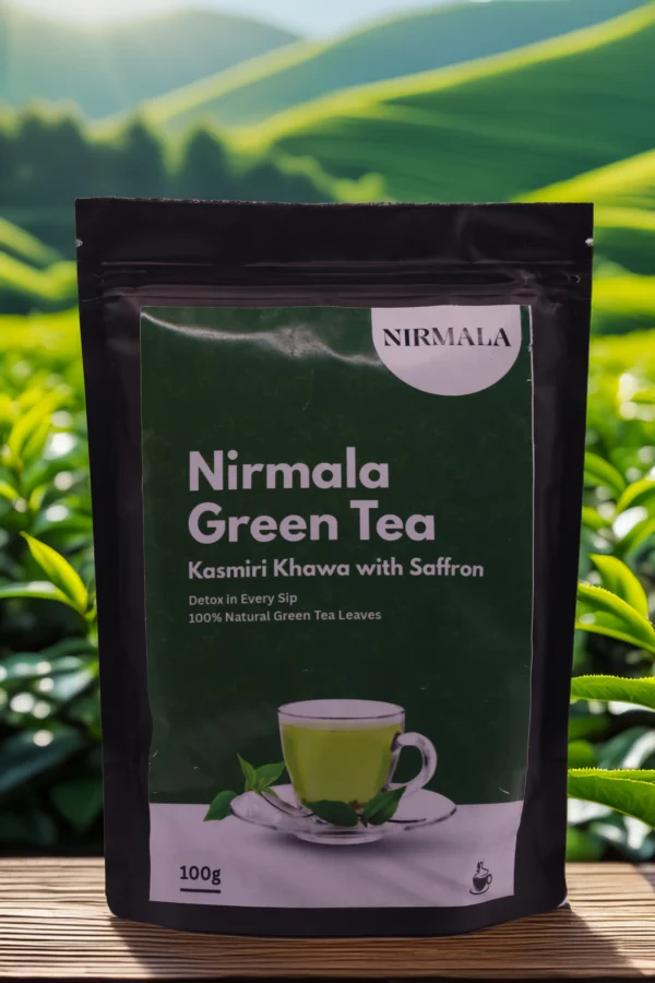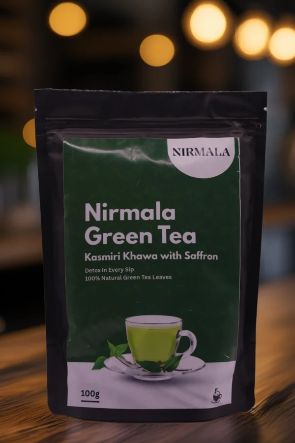 Discover the essence of Kashmir with NirmalaNaturals Kashmiri Khawa Green Tea (100gm). This premium blend combines handpicked green tea leaves with saffron, almonds, cardamom, and traditional spices, creating a warm and aromatic cup. Ideal for personal use, this 100gm pack ensures you enjoy freshness in every brew. With each sip, experience relaxation, improved digestion, and a gentle boost of energy — making it your perfect everyday wellness companion.