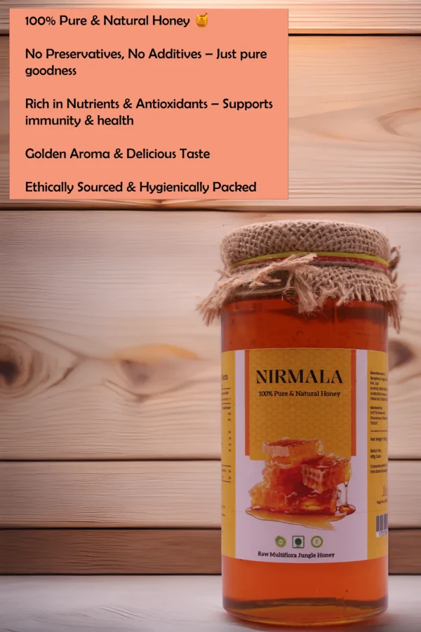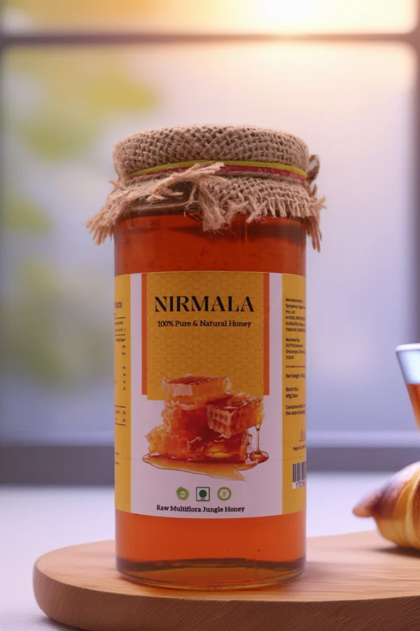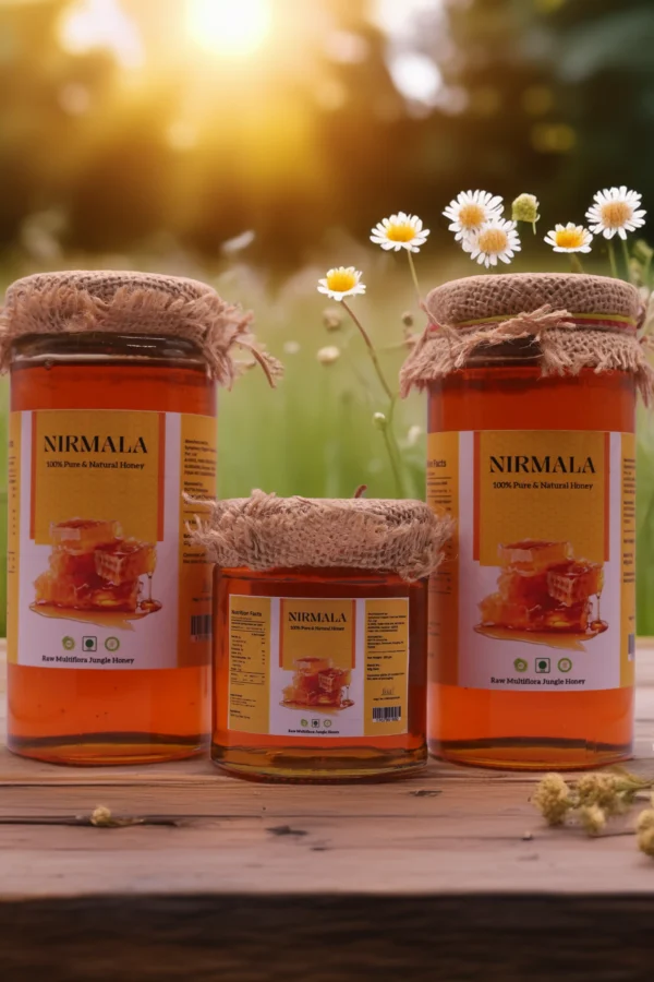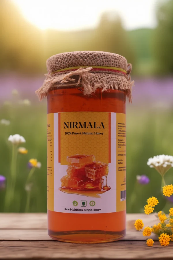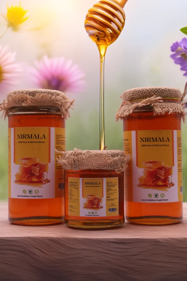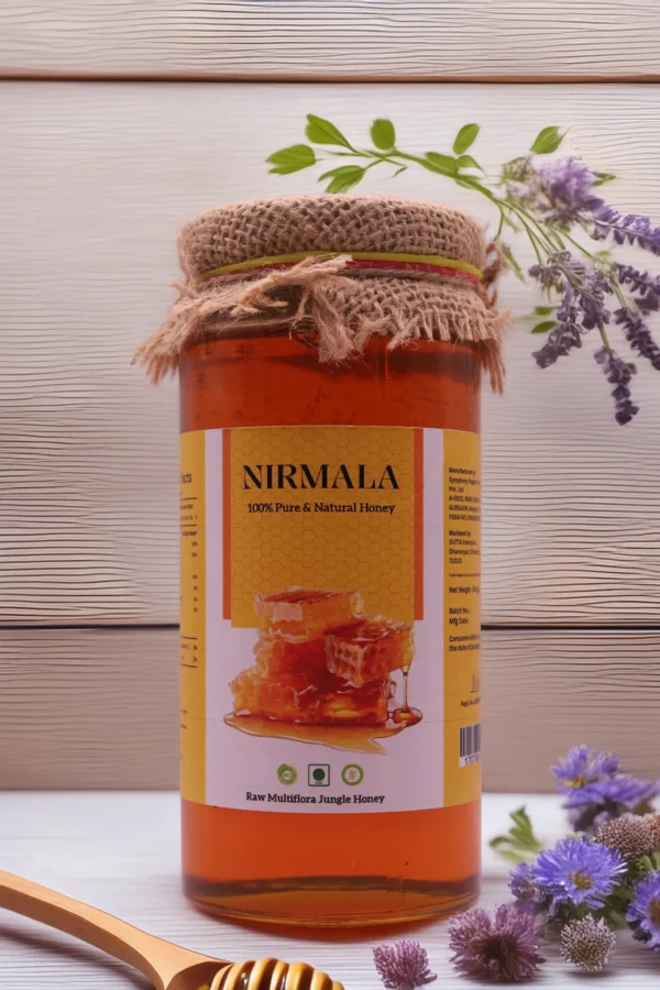 Delight in the richness of NirmalaNaturals Raw Multiflora Jungle Honey (500gm). Harvested from wild jungle blossoms, this honey carries a deep, multifloral flavor that is both nourishing and invigorating. Being raw and unprocessed, it preserves its natural antioxidants and health-boosting properties.