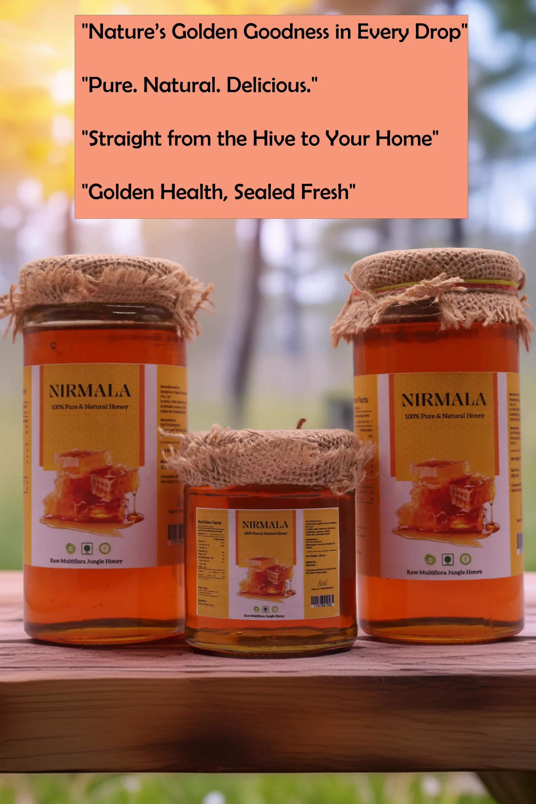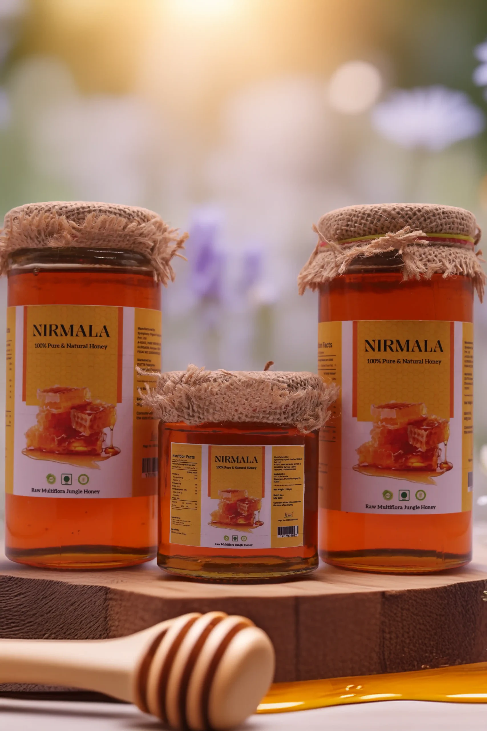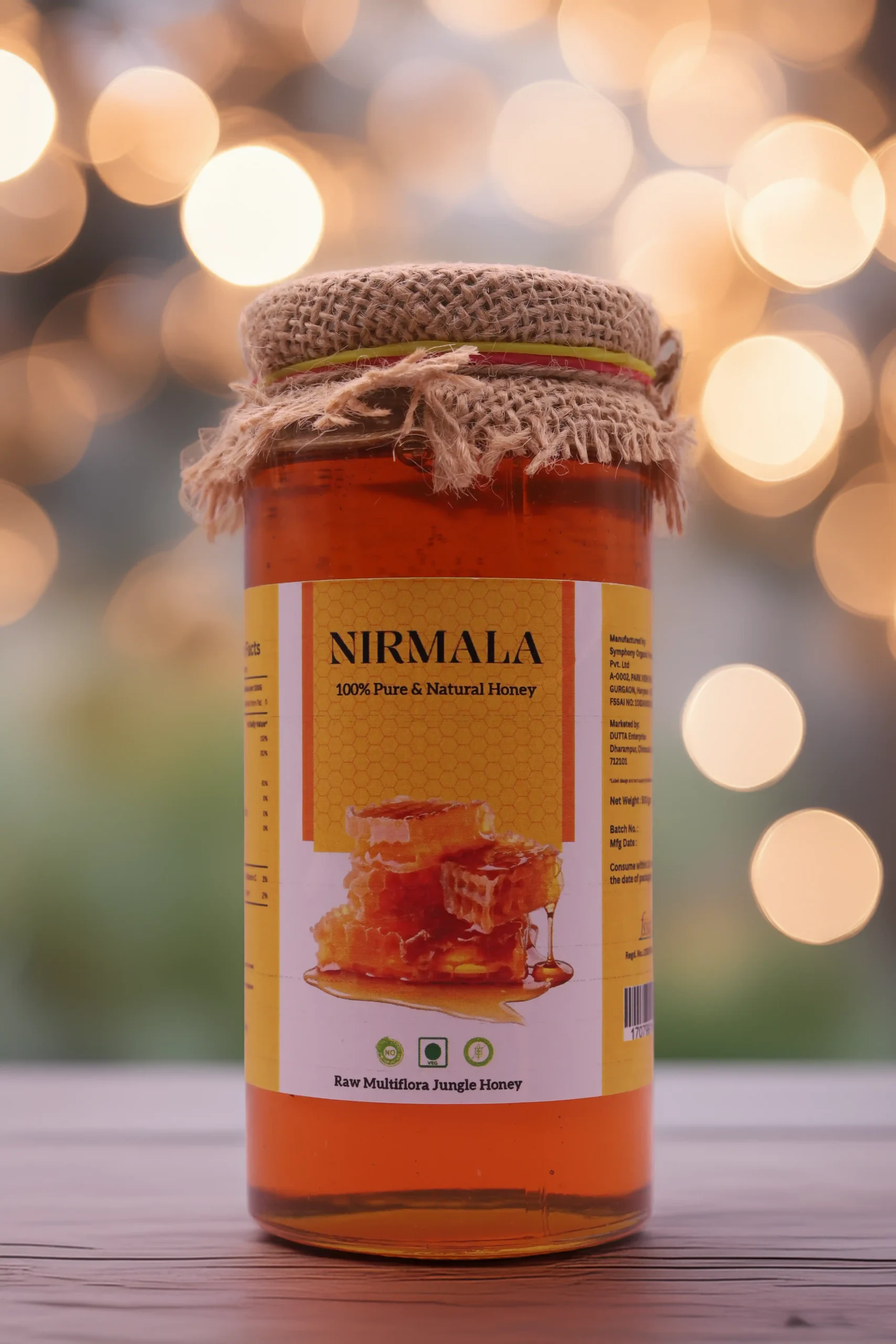 Delight in the richness of NirmalaNaturals Raw Multiflora Jungle Honey (500gm). Harvested from wild jungle blossoms, this honey carries a deep, multifloral flavor that is both nourishing and invigorating. Being raw and unprocessed, it preserves its natural antioxidants and health-boosting properties.