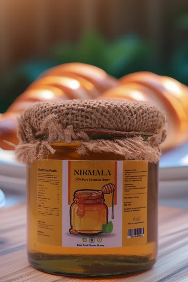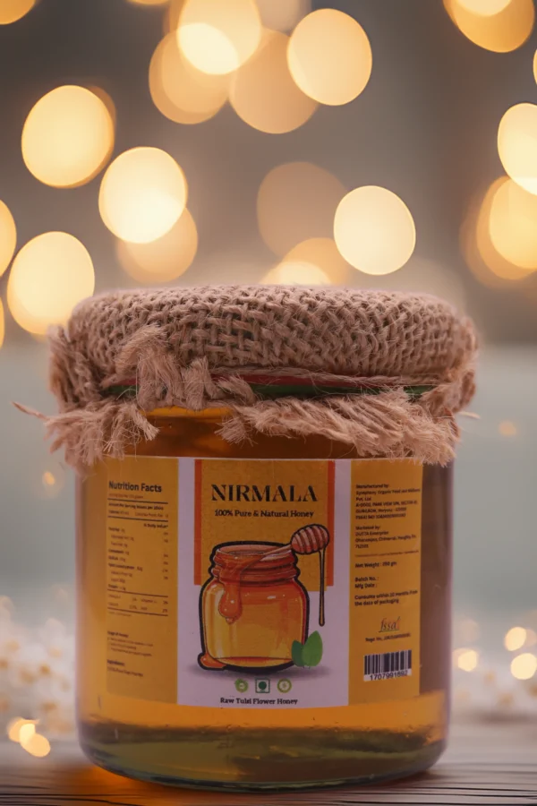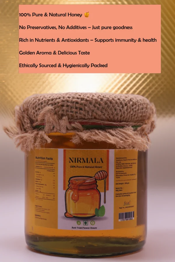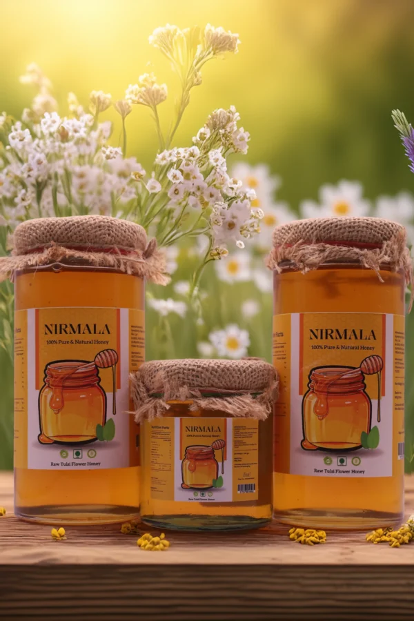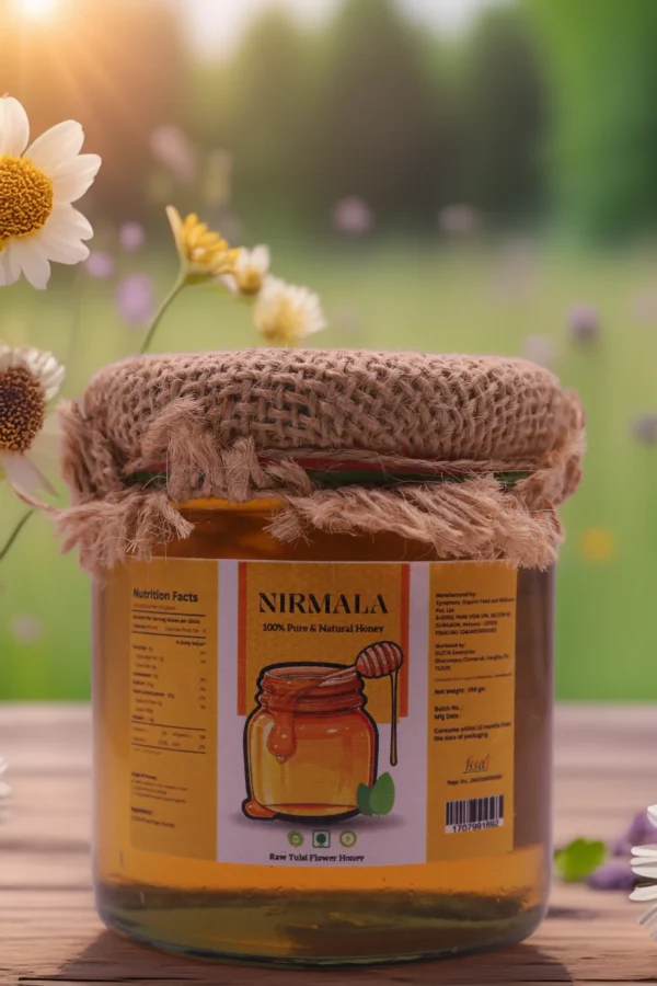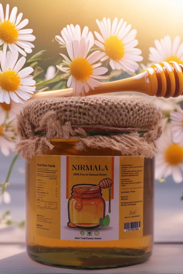 Discover the healing power of nature with NirmalaNaturals Raw Tulsi Flower Honey (250gm). Collected from the nectar of Tulsi (Holy Basil) blossoms, this honey is 100% raw, unheated, and unprocessed, ensuring it retains all its natural enzymes, antioxidants, and medicinal properties. Known for its calming aroma and therapeutic benefits, Tulsi honey supports immunity, improves respiratory health, aids digestion, and helps relieve stress.